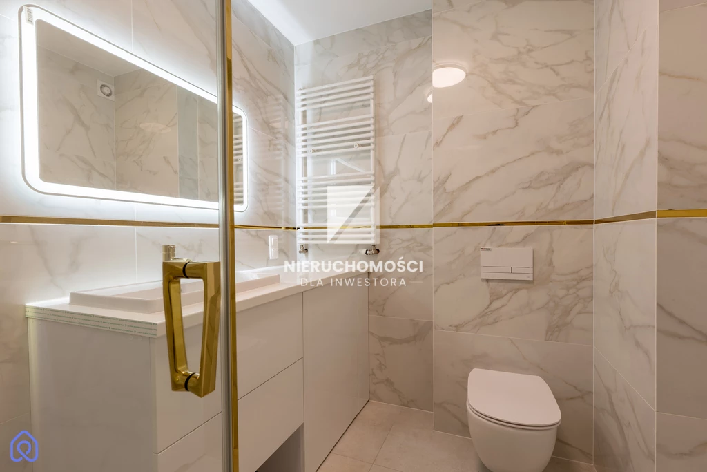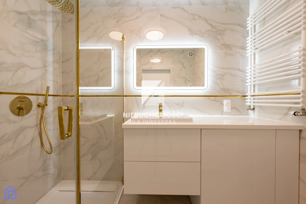 Luksusowa łazienka jak z pięciogwiazdkowego hotelu – marmurowe wykończenie, złote detale i podświetlane lustra sprawią, że każdy poranek zacznie się od odrobiny luksusu.
