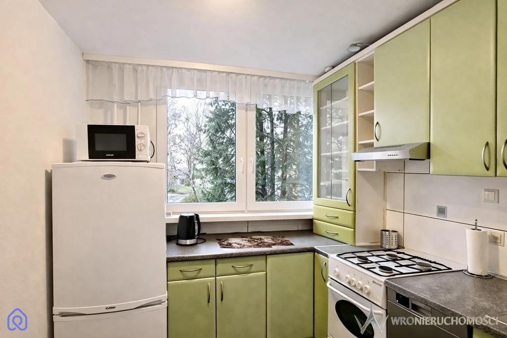 Osobna kuchnia to jeden z mocniejszych atutów tego mieszkania. Daje większą wygodę i lepsze rozdzielenie stref. Na wyposażeniu znajdują się: lodówka z zamrażarką, piekarnik, wyciąg kuchenny, kuchenka gazowa, zmywarka, mikrofalówka, pralka oraz odkurzacz.