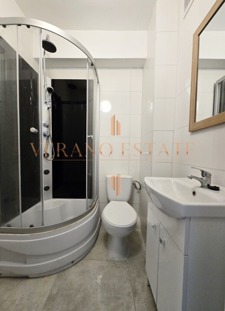 Łazienka z kabiną prysznicową, umywalką i miejscem na pralkę