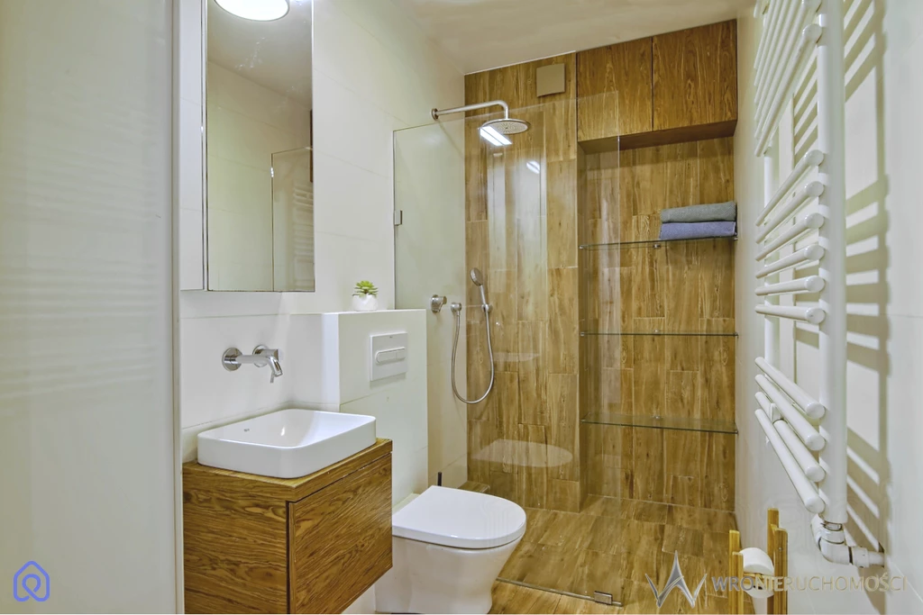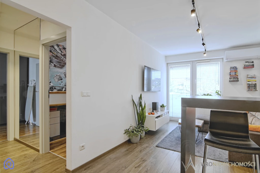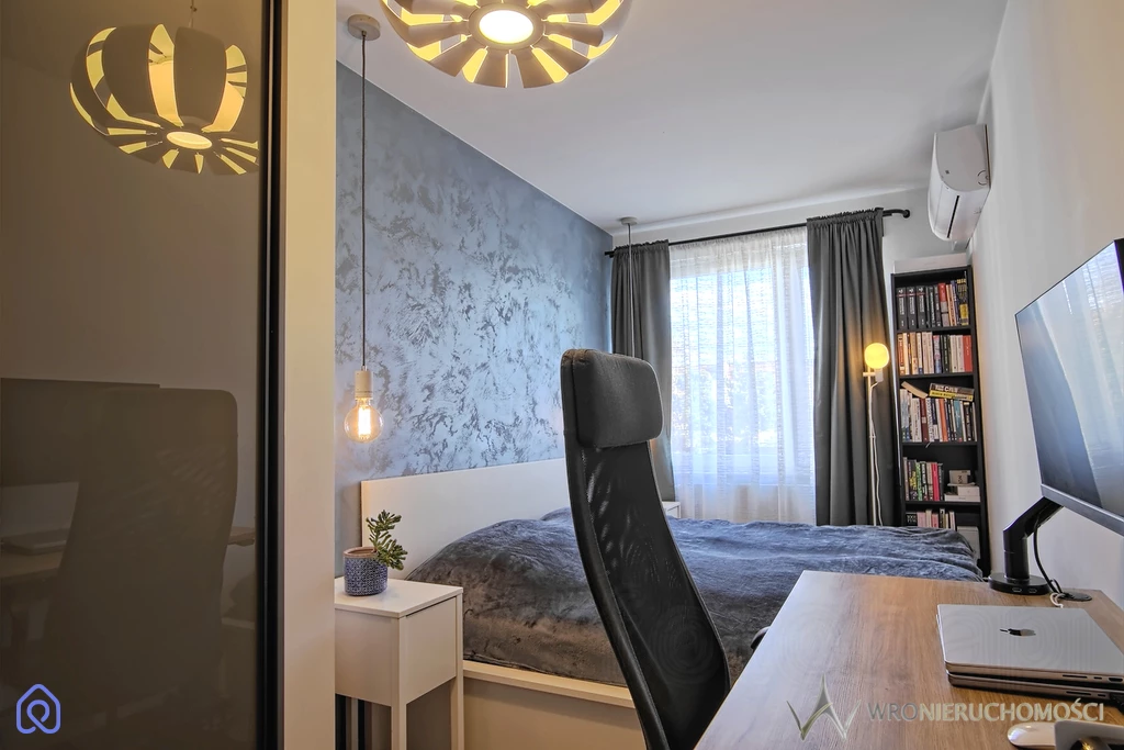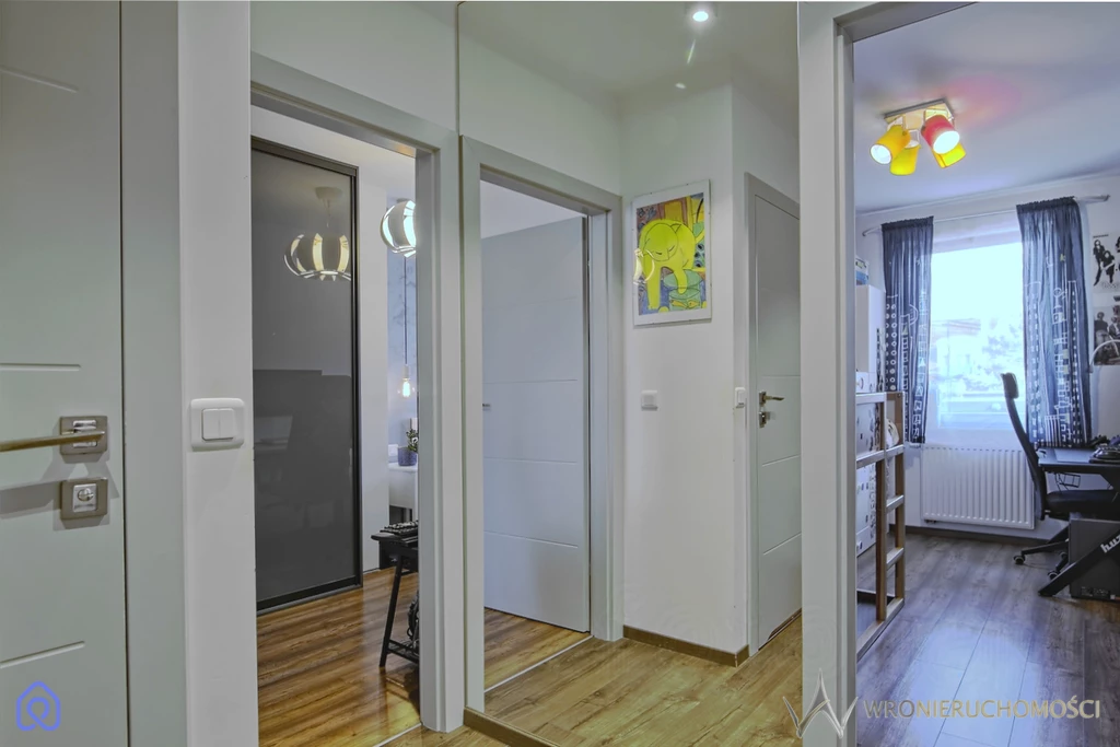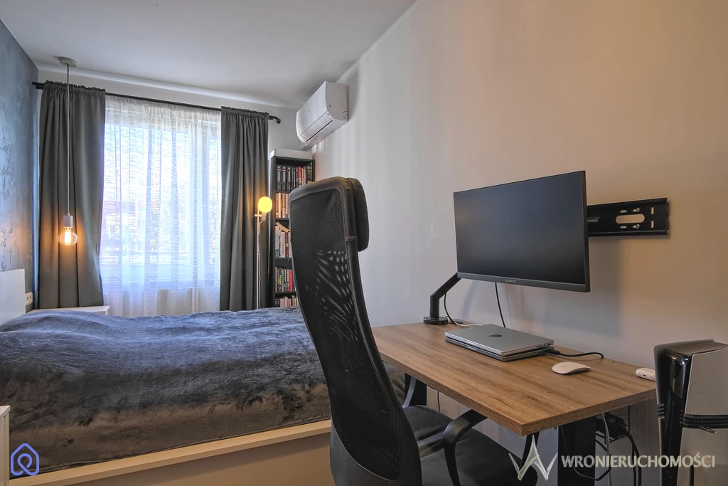 Lokal składa się z ustawnego salonu z dobrze zagospodarowanym aneksem kuchennym z szafkami na wymiar oraz sprawnym sprzętem AGD (w tym płyta indukcyjna, piekarnik, zmywarka, okap, lodówka wolnostojąca z zamrażarką oraz pralkosuszarka). Z salonu wyjście na przyjemny balkon na którym w ciepłe dni można wypić poranną kawę w promieniach słońca. Elegancka przestronna łazienka z prysznicem podłogowym. Dodatkowe dwa pokoje sprawiają iż jest to idealne lokum na start dla Pary (jeden z pokoi może pełnić rolę biura w home office) lub dla Rodziny 2+1. Mieszkanie bez barier- winda z podziemnego parkingu. Ekspozycja wschodnia (wszystkich pomieszczeń). Mieszkanie w dobrym stanie technicznym. Na podłogach dobrej jakości panele (nie zniszczone), w łazience płytki typu wood. W salonie oraz jednej sypialni zamontowana niedawno klimatyzacja.