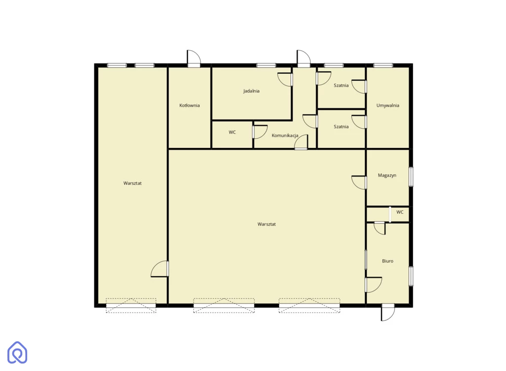 Układ pomieszczeń: 2 hale warsztatowe z 3 bramami garażowymi