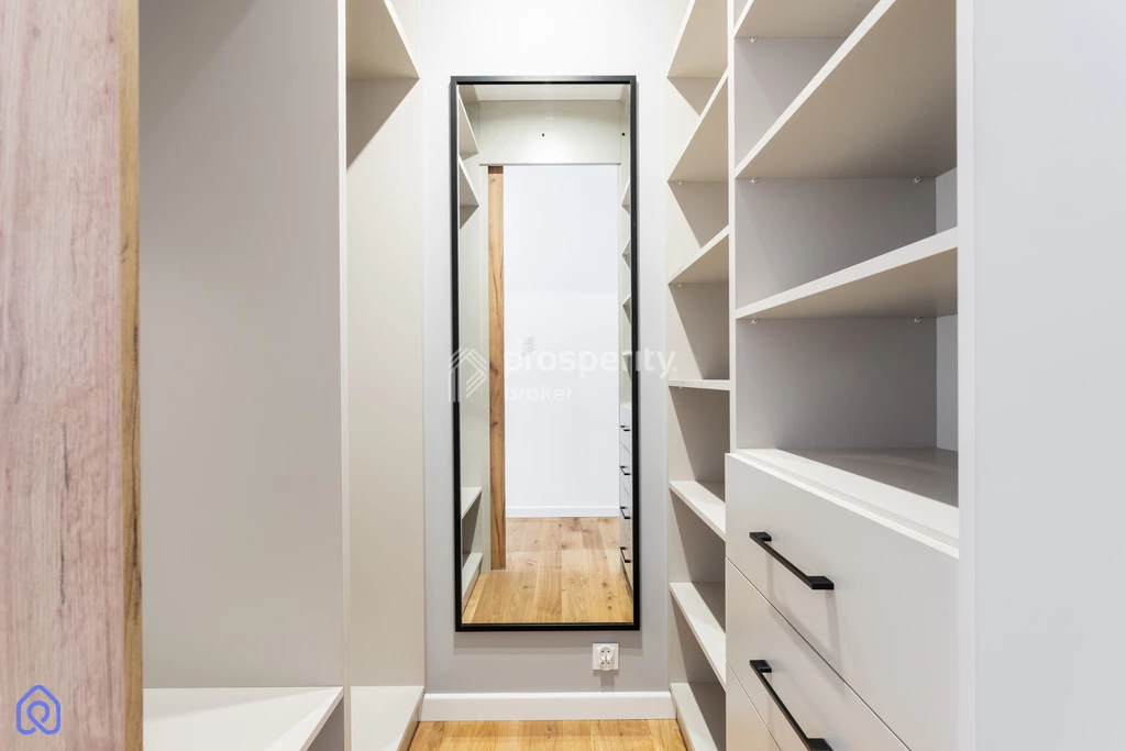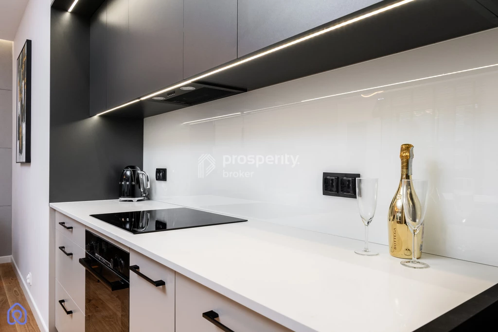 - w pełni wyposażona kuchnia z meblami na wymiar i szafkami do sufitu, odporny na zabrudzenia i uszkodzenia blat z konglomeratu, łatwe w czyszczeniu szkło nad blatem