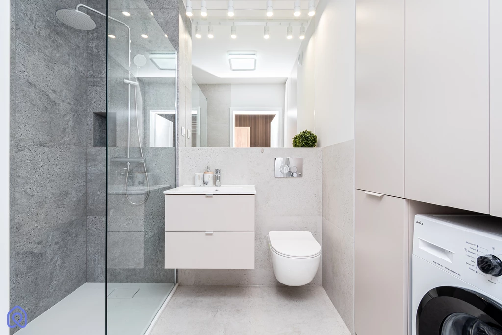 - nowoczesna i elegancka łazienka z pralką, wyposażona w grzejnik elektryczny, będący dodatkowym źródłem ogrzewania;