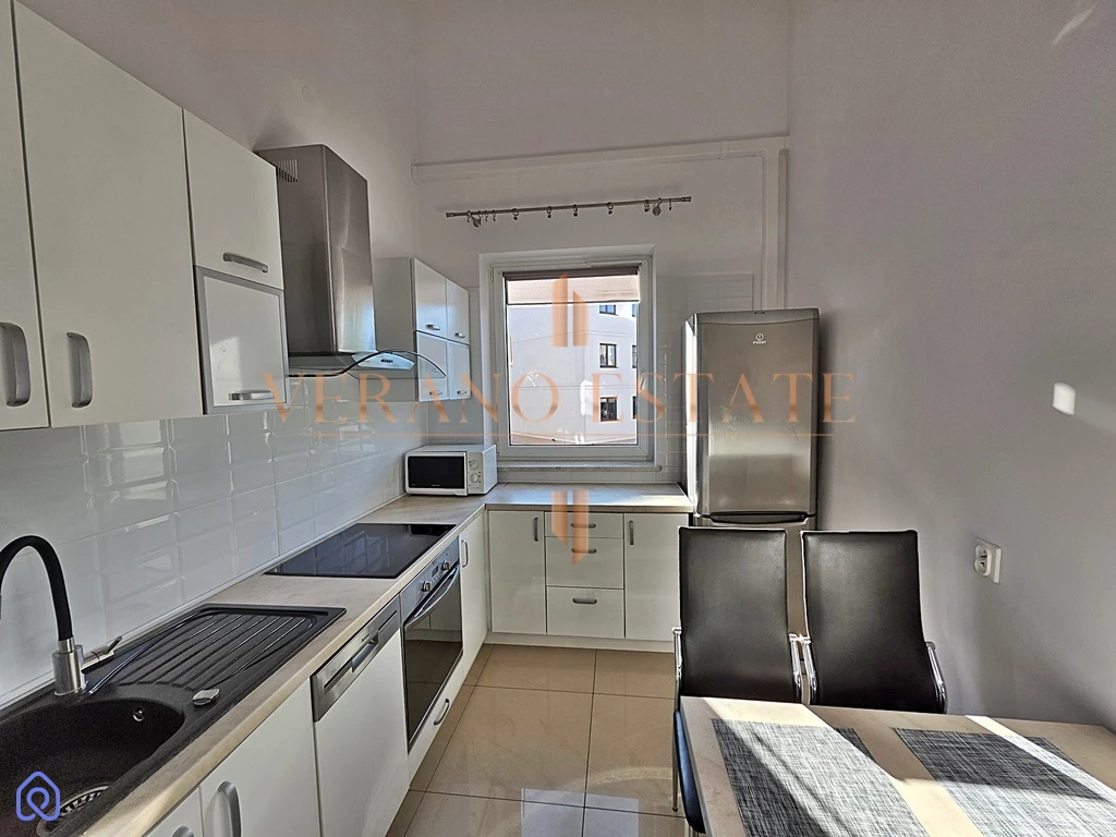 widna kuchnia z pełnym wyposażeniem AGD (okap, zmywarka, płyta indukcyjna, piekarnik, kuchenka mikrofalowa), stół z 4 krzesłami